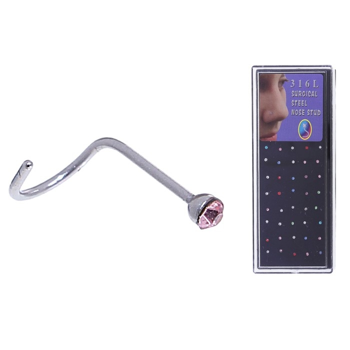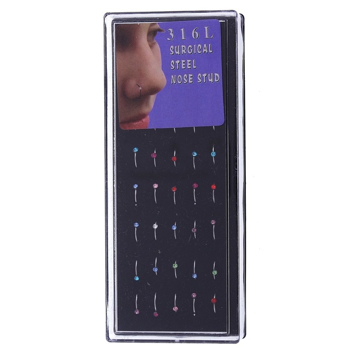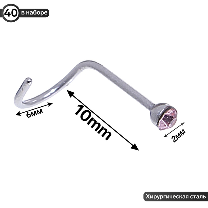 Пирсинг в нос (нострил) «Страза», загнутый, L=10мм, набор 40шт, цвет МИКС в серебре