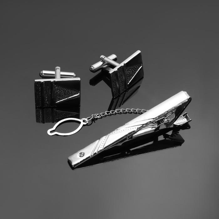 Набор мужской «Запонки + Зажим для галстука» прямоугольник с эмалью, цвет чёрно-серебристый