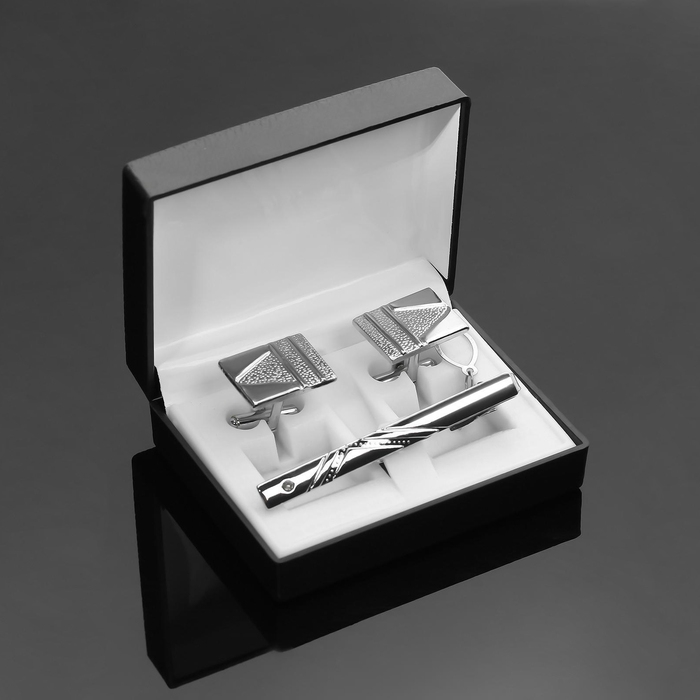 Набор мужской стальной «Запонки + Зажим для галстука» прямоугольник, цвет чёрно-белый в серебре