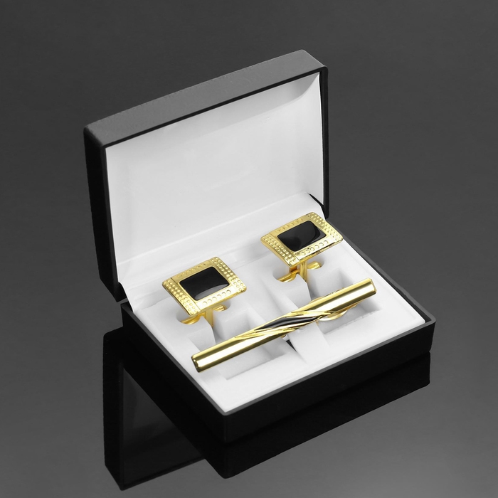 Набор мужской медный «Запонки+Зажим(6 см)для галстука» точеч рисунок, прямоуг, цвет чёрный в зол