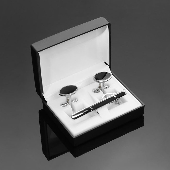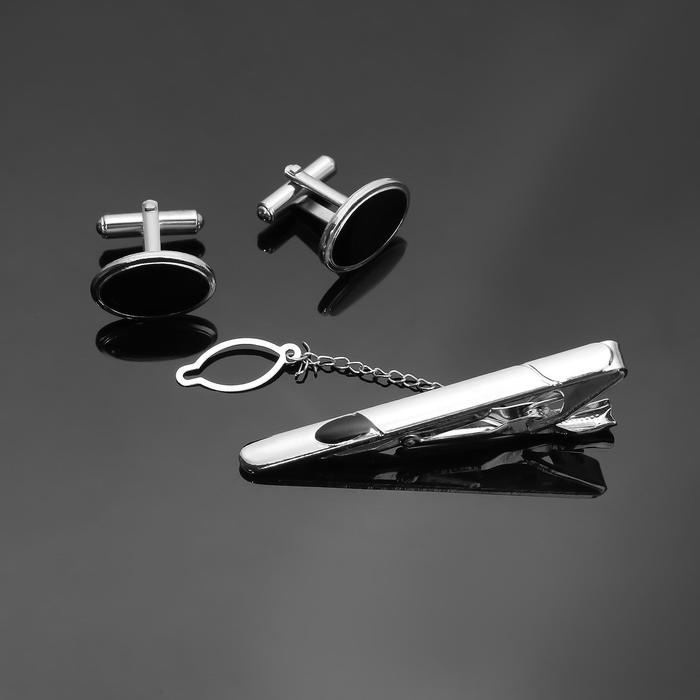 Набор мужской медный «Запонки + Зажим для галстука» овал с эмалью, цвет чёрный в серебре