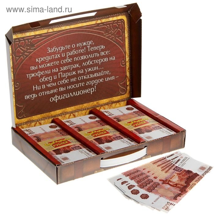 Внутри чемодана находятся 3 стопки 50 денежных купюр и написан текст, который можно использовать в качестве поздравления. Необычный яркий дизайн изделия создаст праздничное настроение и подарит море позитивных эмоций. Теперь можно не только пожелать чемодан денег, но и подарить его! Деньги подойдут для всевозможных игр, конкурсов, розыгрышей, выкупа невест, также подойдут для пистолета который стреляет деньгами. Пачки имитируют настоящие деньги, но платежным средством не являются.