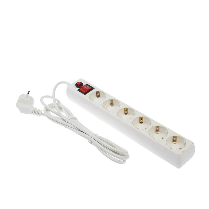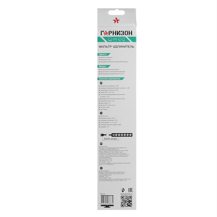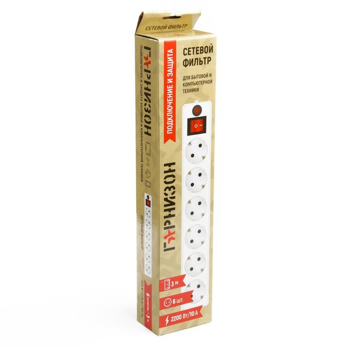 Сетевой фильтр "Гарнизон", 6 розеток, 3 м, 10 А, 2200 Вт, с з/к, белый
