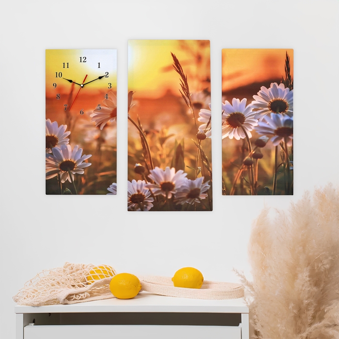 Часы-картина настенные, модульные "Ромашки на закате", бесшумные, 60 х 80 см