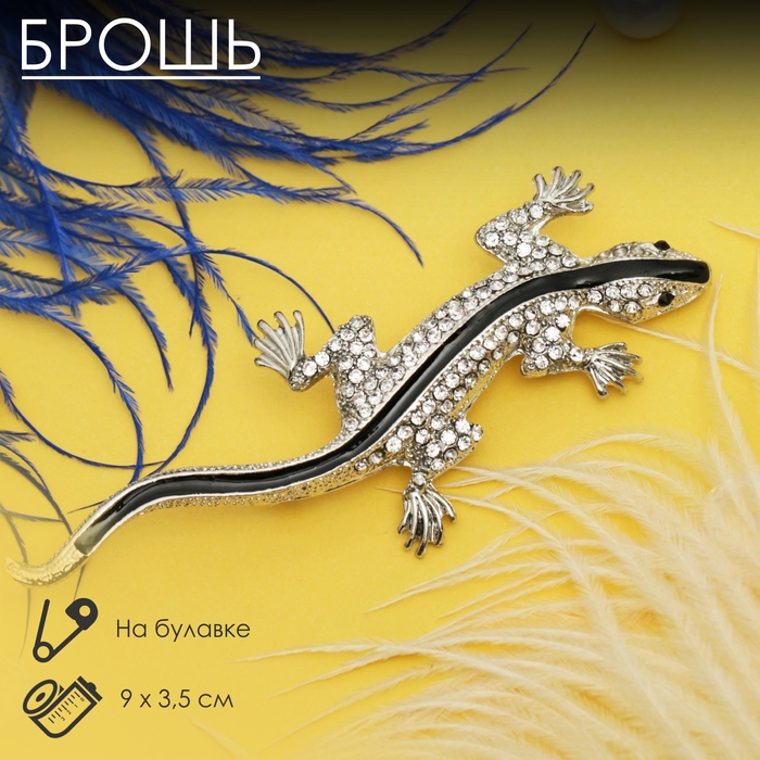 Брошь «Ящерка бриллиантовая», цвет чёрно-белый в серебре