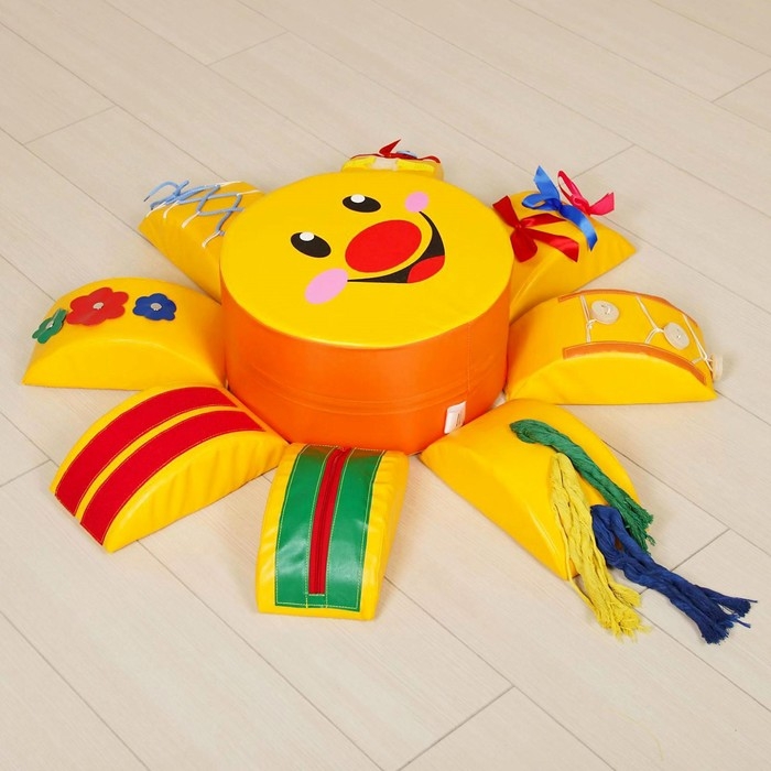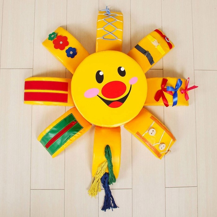 Мягкий дидактический модуль, выполненный в виде улыбающегося солнышка, станет превосходным помощником в развитии малыша. Комплекс состоит из яркого пуфа и восьми лучиков, каждый из которых снабжён шнуровками, ремешками, ленточками и другими занимательными элементами. Ребёнок с удовольствием будет менять местами фигуры, играть с молниями, пряжками и тесьмой, тем самым улучшая мышление, мелкую моторику и тактильное восприятие.