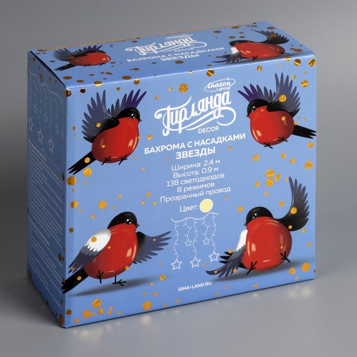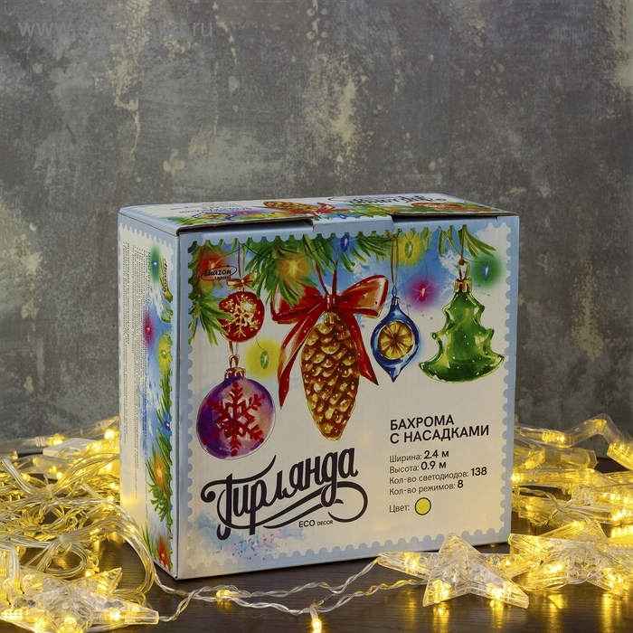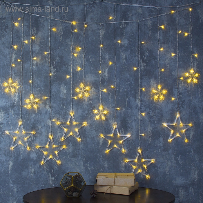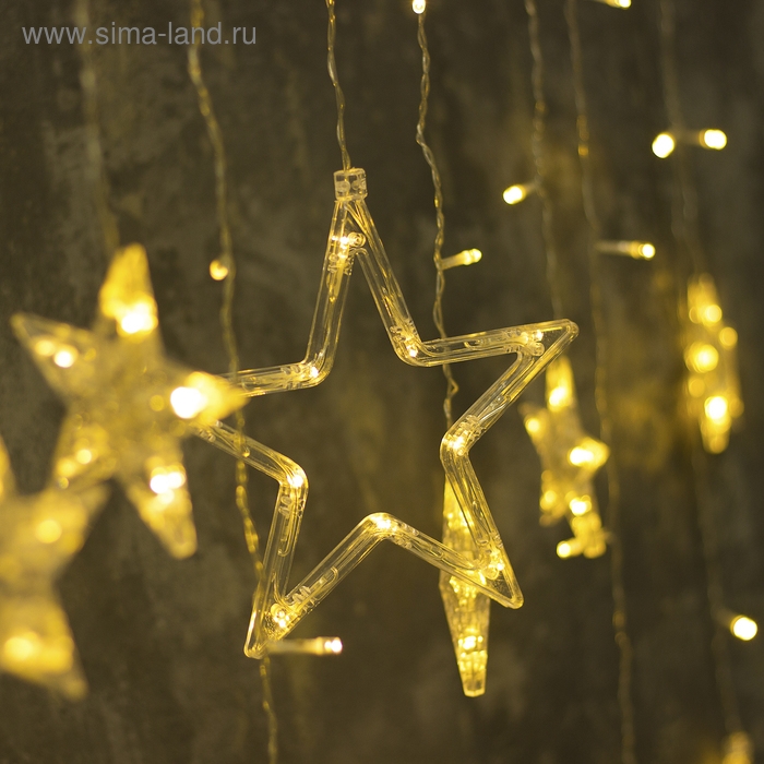 Гирлянда «Бахрома» 2.4 × 0.9 м с насадками «Звёзды», IP20, прозрачная нить, 138 LED, свечение тёплое белое, 8 режимов, 220 В