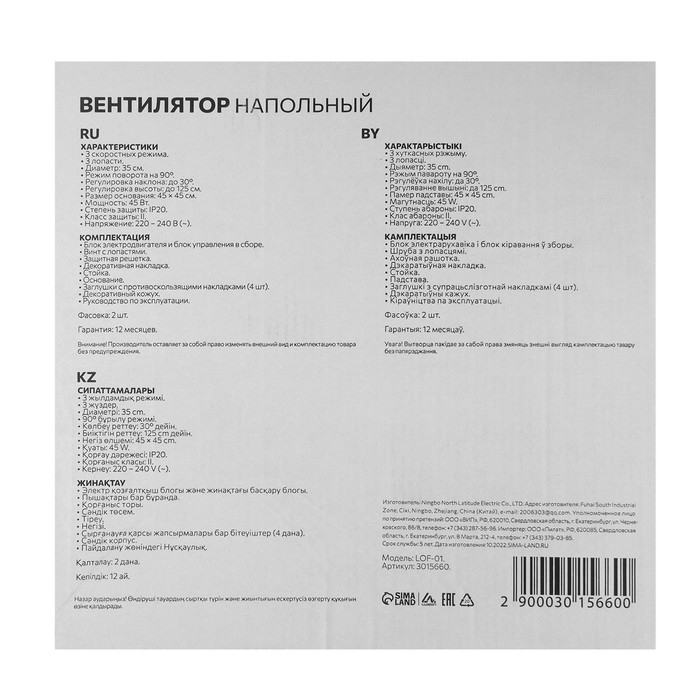 Напольный вентилятор Luazon LOF-01, 45 Вт, 3 режима, бело-синий