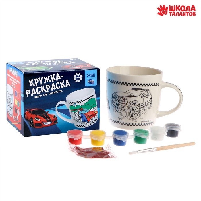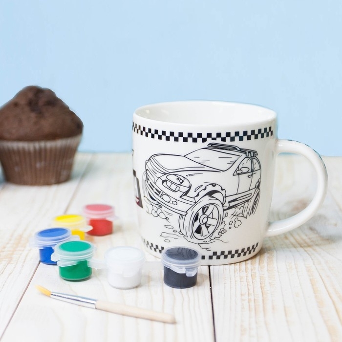 На кружке нанесены контуры будущего изображения, которые крохе предстоит заполнить акриловыми красками. После высыхания они хорошо держатся на керамической поверхности, так что изделие можно будет мочить и даже разогревать в микроволновой печи.