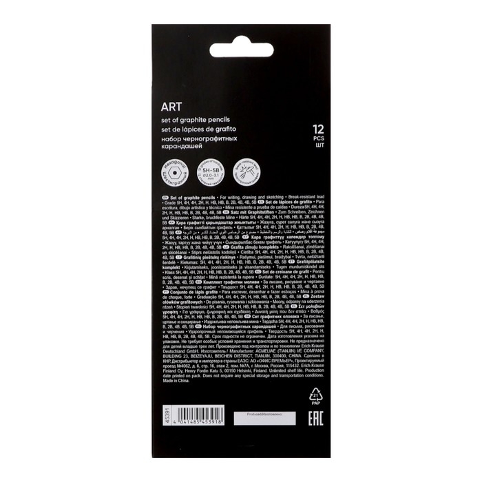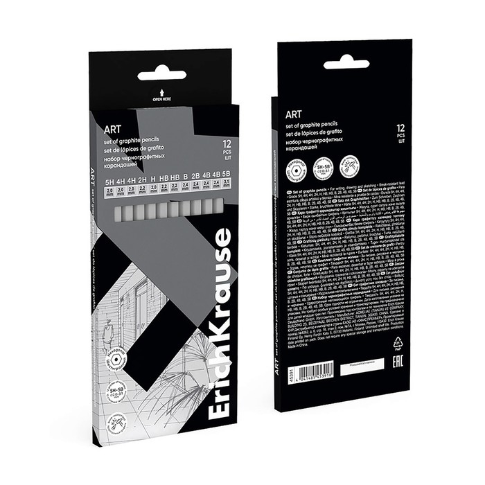 Классические шестигранные чернографитные карандаши различной степени твердости. Рекомендуются для выполнения художественных работ, графических зарисовок и чертежей. Грифель диаметром 2,2мм не царапает бумагу и не крошится. Насыщенность каждого графитового оттенка зависит от степени его жёсткости. Специальная пропитка древесины и сплошная проклейка грифеля обеспечивает высокую ударопрочность. Мягкая древесина и идеальная центровка грифеля гарантируют легкую заточку с экономным расходом карандаша.