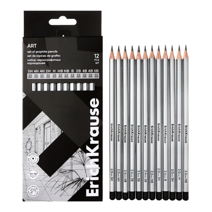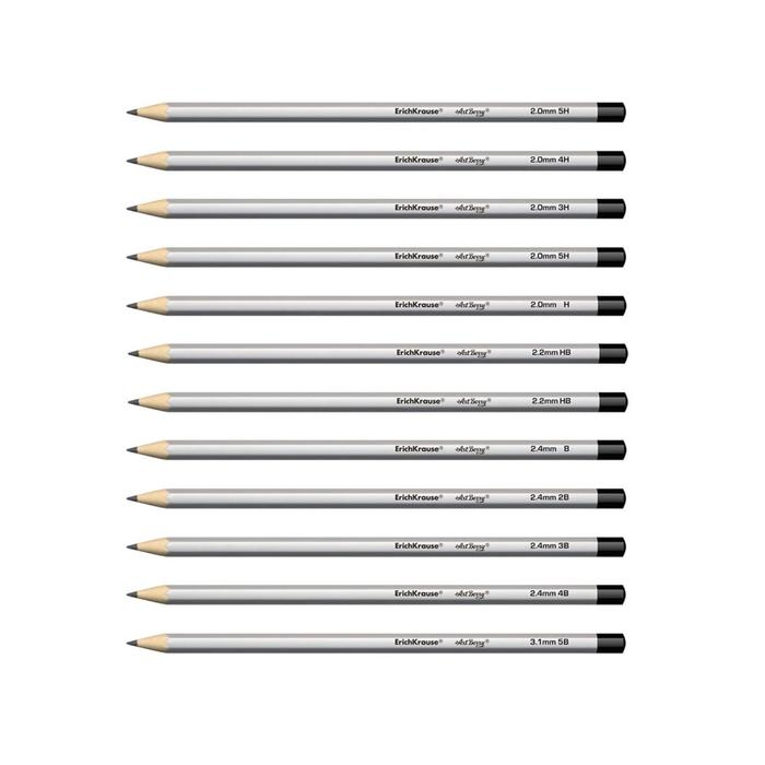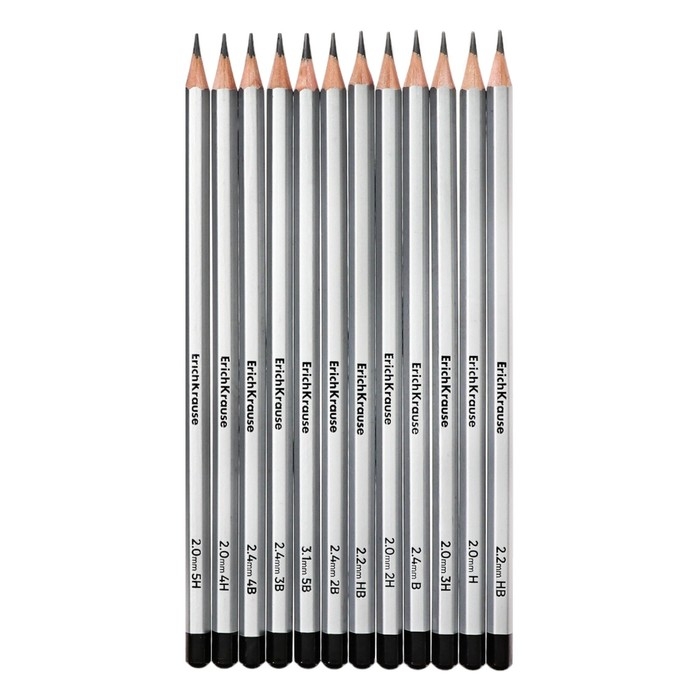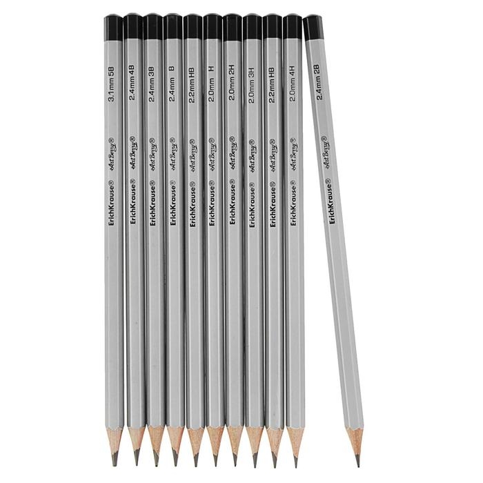 Набор карандашей чернографитных различной твердости 12 штук, ErichKrause, грифель d=2.2 мм, шестигранные, ударопрочные, серебро, в коробке