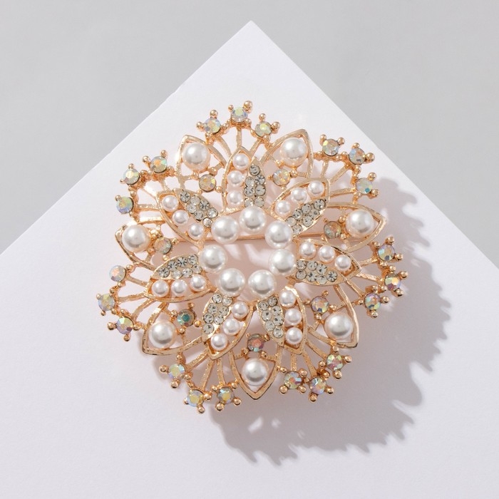 Брошь «Цветок» многослойный с жемчугом, цвет белый в золоте