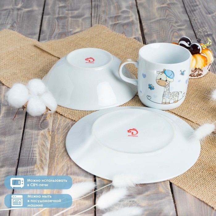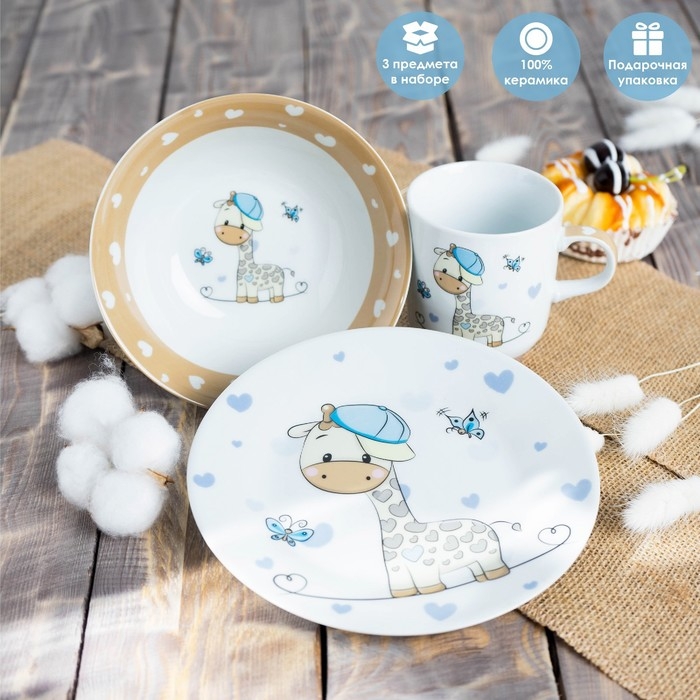 Набор детской посуды из керамики Доляна «Жирафик», 3 предмета: кружка 230 мл, миска 400 мл, тарелка d=18 см