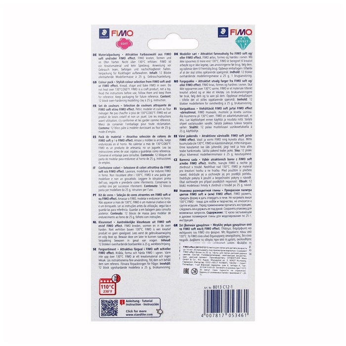 Полимерная глина FIMO подходит для начинающих мастеров и професиональных художников.ОсобенностиМасса мягкая, поэтому вы легко придадите ей нужную форму.Цвета можно смешивать для получения необходимых оттенков, которые сохранятся после обжига.После запекания изделия становятся прочными и долговечными.Упаковка легко открывается без использования ножа. Если вы не полностью израсходовали блок, то остатки можно завернуть в упаковку — так глина лучше сохранится.Термическая обработка. Готовое изделие поместите внутрь духовки на тарелке, стекле или фольге. Температура обжига не должна пpeвышaть 130 °С.Пластика рекомендована для детей старше 8 лет.
