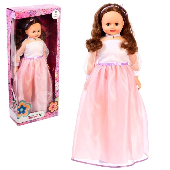 - На голове куклы ободок с аккуратным бантиком, на ногах туфли. Кукла одета в пышное платье, его цвет может различаться в зависимости от партии.