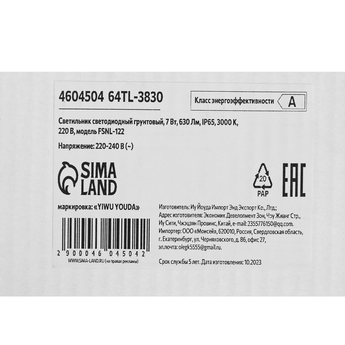 Светильник светодиодный грунтовый, 7 Вт, 630 Лм, IP65, 3000 К, 220 В