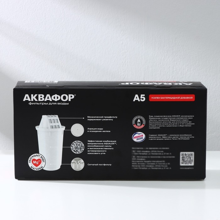 Конструкция картриджа A5 позволяет ему самоочищаться при наборе воды в воронку. Крупные частицы не забивают фильтр в течение заявленного срока службы, позволяя дольше задерживать опасные растворённые вещества, включая хлор, органические соединения и тяжёлые металлы.