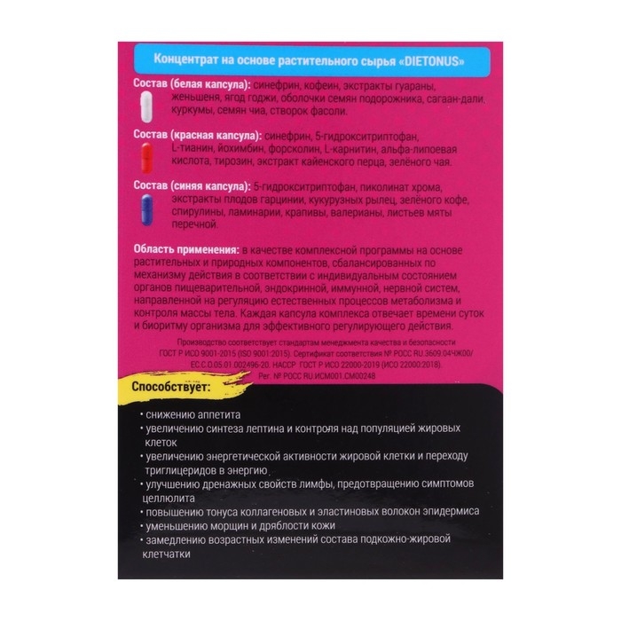 Область применения: в качестве комплексной программы на основе растительных и природных компонентов, сбалансированных по механизму действия в соответствии с индивидуальным состоянием органов пищеварительной, эндокринной, иммунной, нервной систем, направленной на регуляцию естественных процессов метаболизма и контроля массы тела. Каждая капсула комплекса отвечает времени суток и биоритму организма для эффективного регулирующего действия.