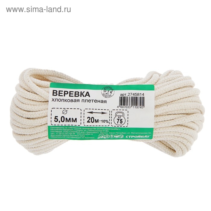 Веревка хлопковая плетеная 5.0 мм, 20 м, без покрытия