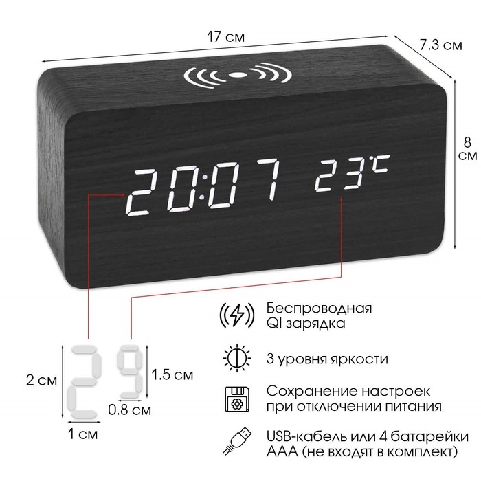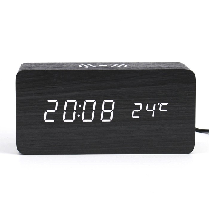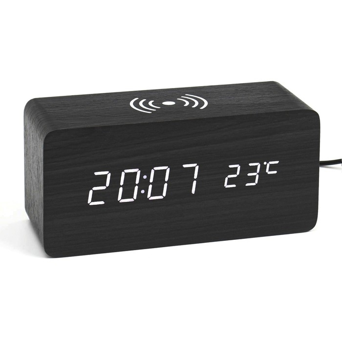 Часы настольные электронные из МДФ с будильником, тремометром и с возможностью беспроводной зарядки телефона и другой электроники представлены в современном дизайне с имитацией натурального дерева. Интерьерные часы станут прекрасным декором для дома и дачи, их можно поставить как на прикроватную тумбочку в спальне, детской комнате, гостиной так и на стол или на комод в зале, холле или на кухне. Часы настольные обладают громким будильником, ребенку и вам будет комфортно просыпаться, на работу и в школу. Будильник не требует частой замены батареек благодаря экономичному механизму.