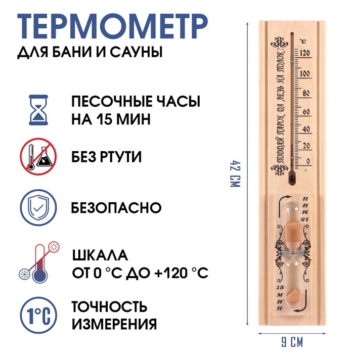 Термометр, градусник для бани и сауны, с песочными часами на 15 минут, от 0°C до +120°C
