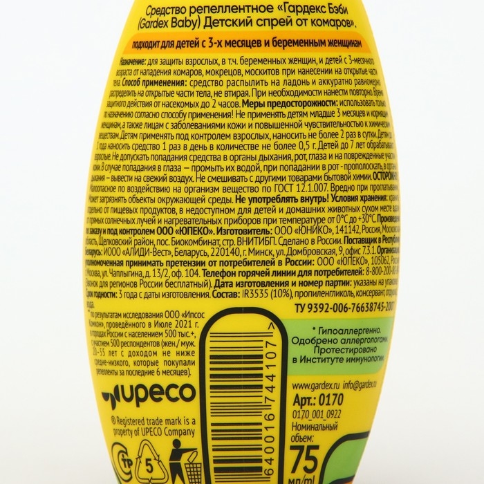 Спрей от комаров Gardex Baby, детский, от 3х месяцев, 75 мл