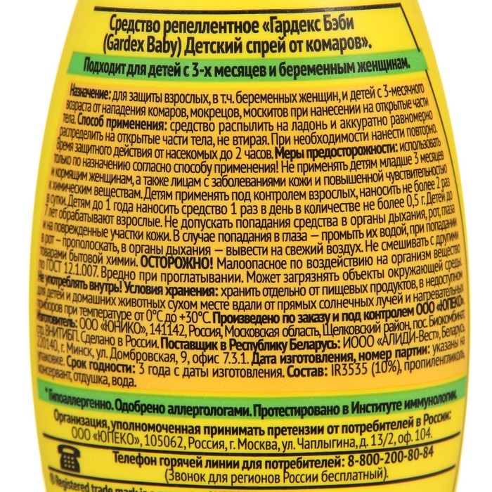 Активное вещество:IR3535® 10%, пропиленгликоль, отдушка, водаОписание:Все мамы знают, что иммунитет ребенка формируется до года, поэтому в этот период малыш нуждается в особенно надежной защите. И даже безопасные для взрослого человека укусы комаров могут вызвать на нежной коже ребенка сильный отек, зуд и даже спровоцировать аллергию.Отнеситесь к защите Вашего ребенка ответственно с детским спреем от комаров Gardex Baby. Это средство подходит для детей от 3 месяцев и даже будущих мам, т.к. в его составе абсолютно безопасное действующее вещество IR3535. IR3535 относят к действующим веществам последнего поколения, оно обеспечивает бережную и надежную защиту от комаров, мокрецов, москитов даже для самых маленьких.Спрей можно наносить на нежную кожу малыша или на одежду, коляску, ребенок будет под защитой до 2 часов во время прогулки.Состав спрея Gardex Baby абсолютно гипоаллергенный, поэтому идеально подходит для защиты нежной детской кожи и для людей, склонных к аллергии.Защитите своего самого дорогого человека с детским спреем от комаров Gardex Baby.Способ применения и дозыРаспылить спрей на ладонь и нанести, не втирая, на открытые участки тела.