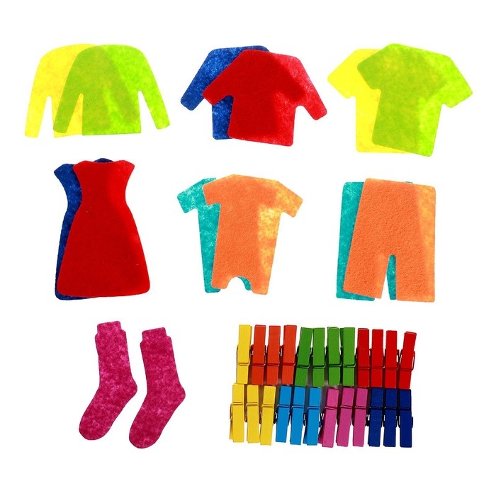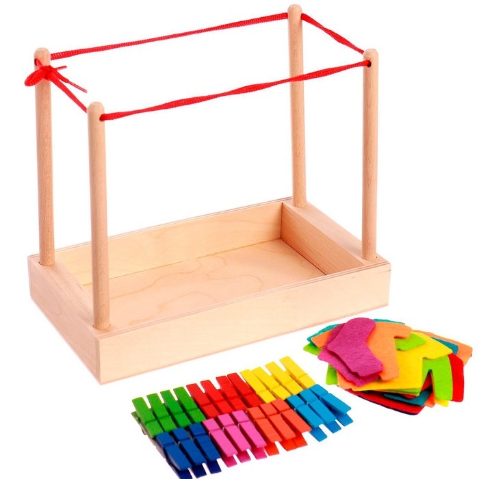 Яркий игровой набор «Стирка» привлечёт внимание каждого ребёнка. Помогите малышу собрать конструкцию с бельевой верёвкой и рассыпьте перед ним разноцветные фетровые предметы одежды и деревянные прищепки. Ребёнку будет полезно и интересно познакомиться с разными материалами, цветами и формами. А также помочь взрослому с развешиванием белья.