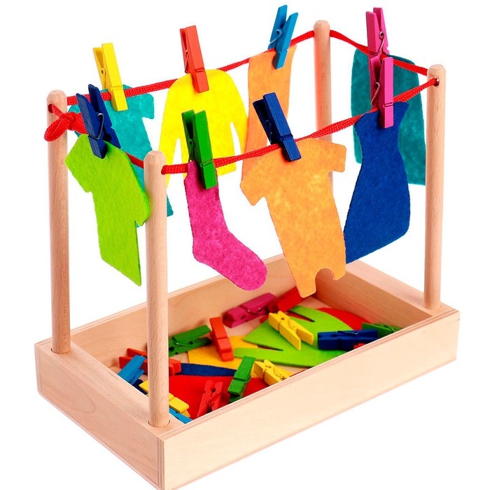 - Играя с ребёнком, попросите его повесить на верёвку предметы одежды определённых цветов и форм.