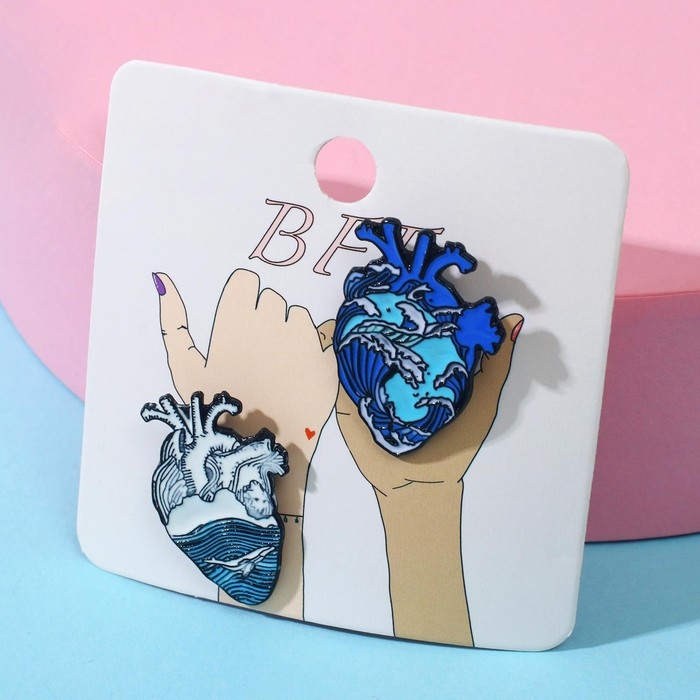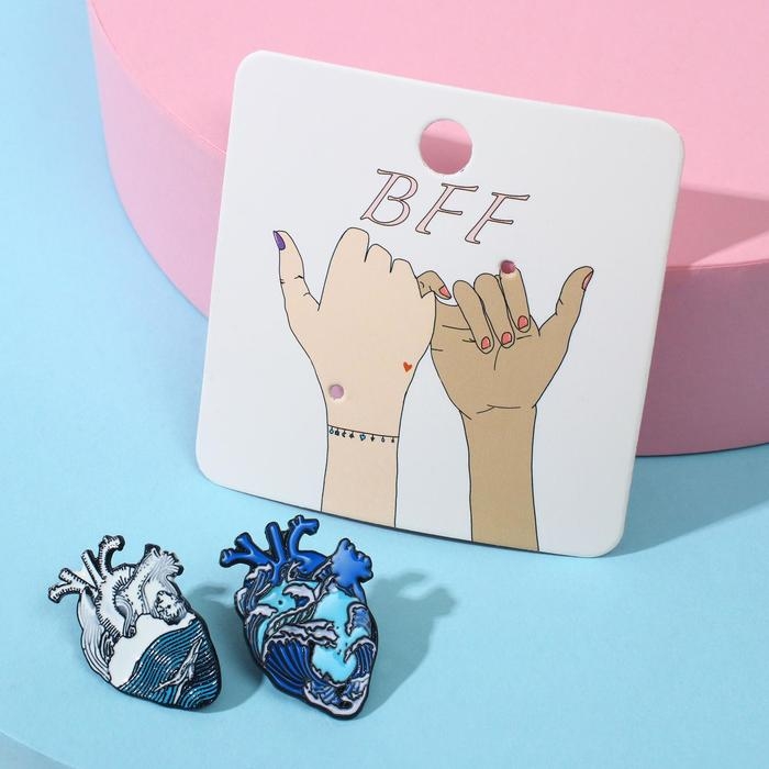 Значки-неразлучники «Сердца» бэст фрэндс, цвет бело-голубой в чёрном металле