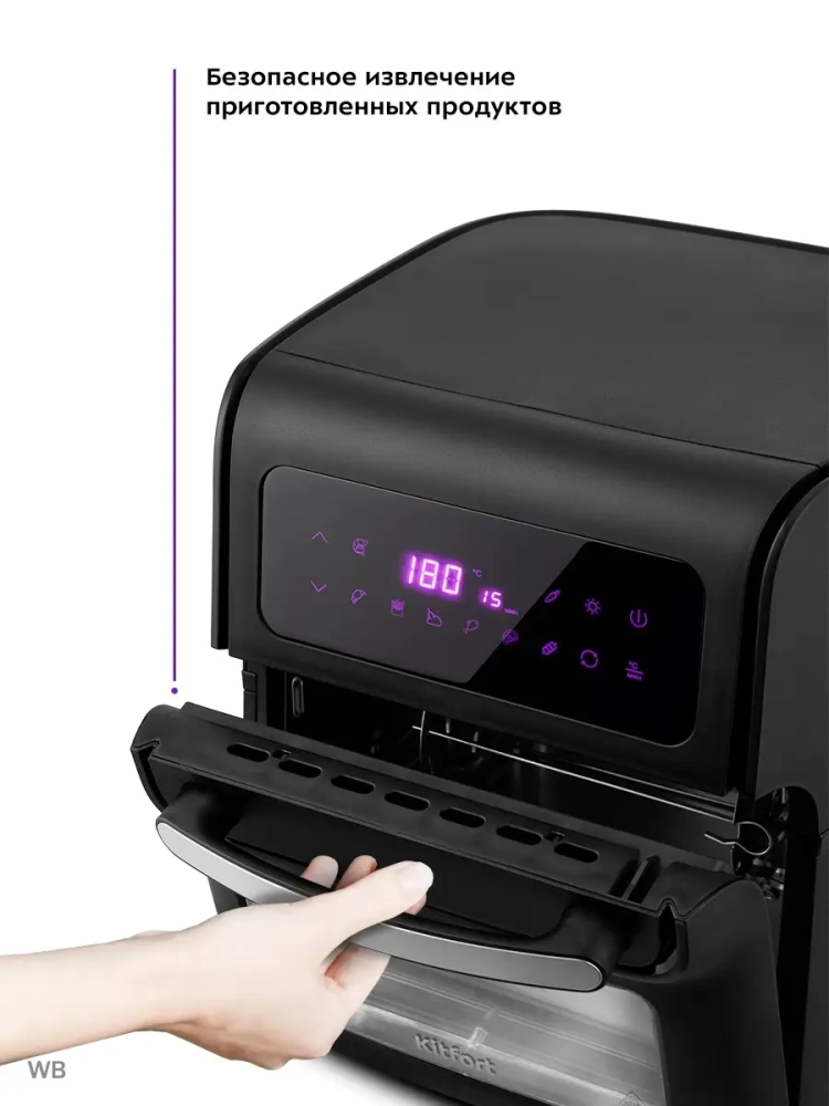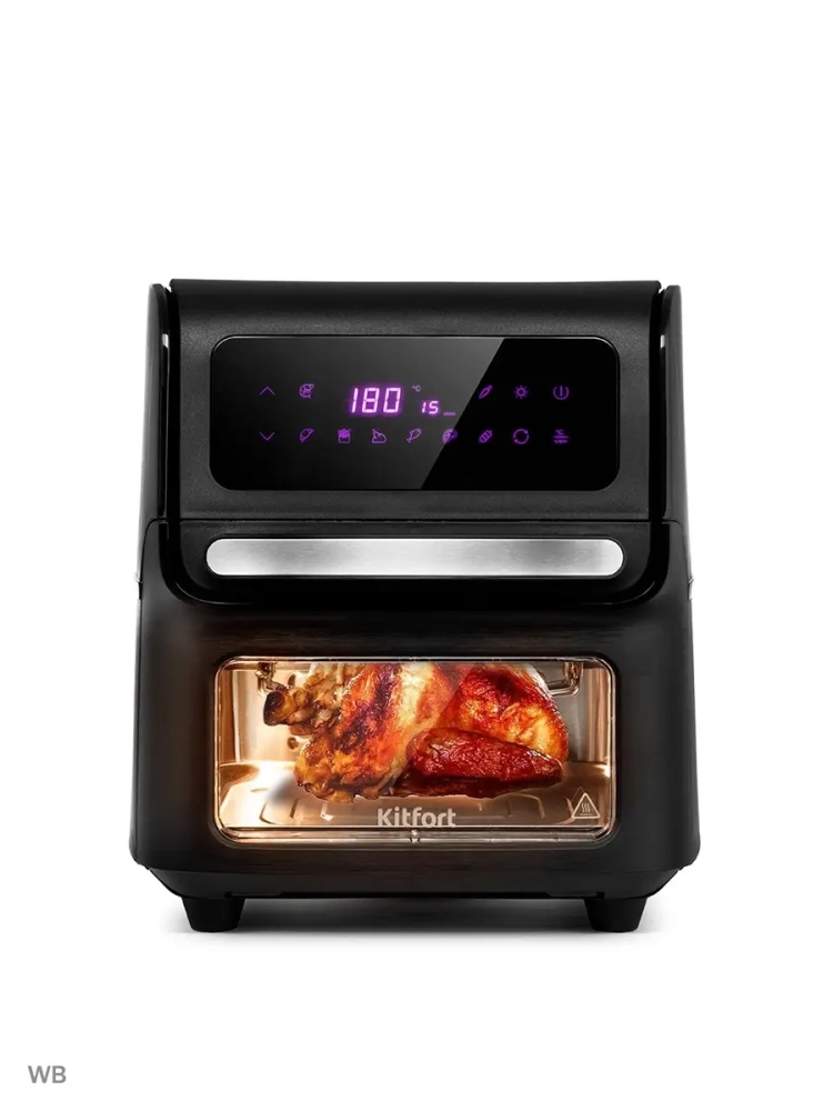 Аэрогриль Kitfort KT-2236 является универсальным устройством для приготовления пищи, он совмещает в себе множество функций: аэрогриль, духовка, шашлычница и сушилка для овощей и фруктов. В комплекте к аэрогрилю идут сетка и сетчатый противень для приготовления или сушки продуктов, вертел с вилками для приготовления курицы-гриль или больших порций мяса, шампуры для приготовления шашлыка. Также в комплекте идет вращающаяся корзина, в которой можно сушить или жарить продукты, такие как овощи, картофель фри, орехи, семечки и т.д. Для того чтобы стекающий жир и сок с продуктов не загрязнял внутренние поверхности предусмотрен специальный поддон для жидкости который устанавливается на дно камеры. При помощи системы циркуляции горячего воздуха продукты равномерно обжариваются со всех сторон и получаются нежными внутри и с хрустящей корочкой снаружи. Аэрогриль оснащен электронным управлением и дисплеем, а также у прибора есть 8 автоматических программ и программа с настройками вручную. В камере аэрогриля находится лампочка, которая подсвечивает камеру изнутри, чтобы можно было наблюдать за процессом приготовления. Лампочку можно включить и выключить с помощью кнопки на панели управления. По окончании приготовления аэрогриль автоматически отключается. Объём 15 л. Регулировка температуры 75-200°C с шагом 5°C. Таймер 1-60 мин с шагом 1 мин. Размер вращающейся корзины Ø142 х 178 мм. Размер поддона для жидкости 295 х 255 х 17 мм. Размер сетки 295 х 235 мм. Размер противня 295 х 235 х 23 мм.