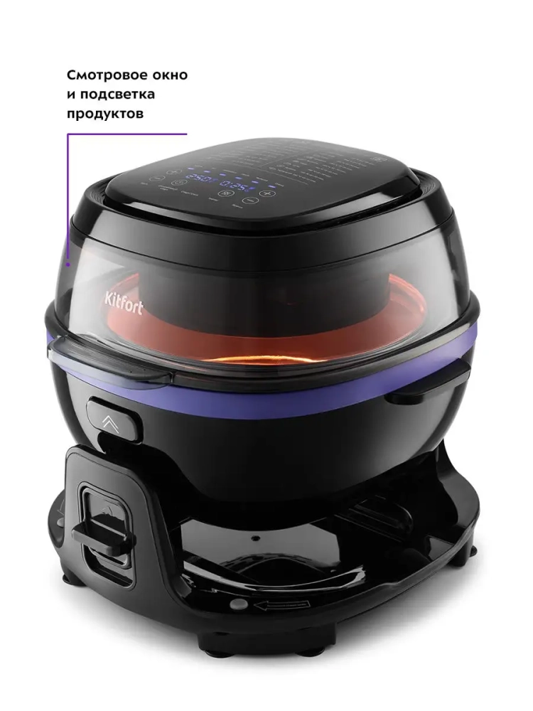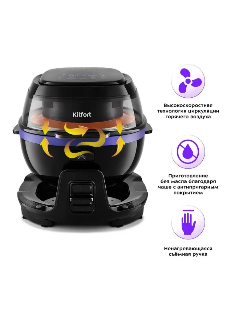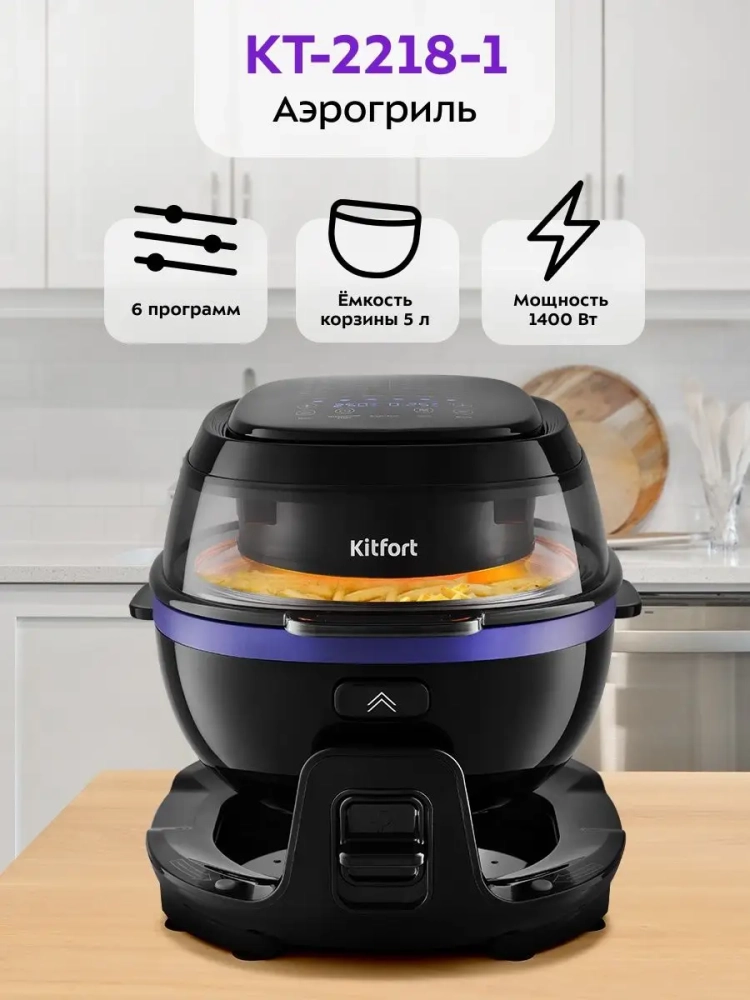 Современный классический аэрогриль Kitfort КТ-2218 замечателен стильным дизайном, а также позволяет готовить большинство продуктов без добавления масла.