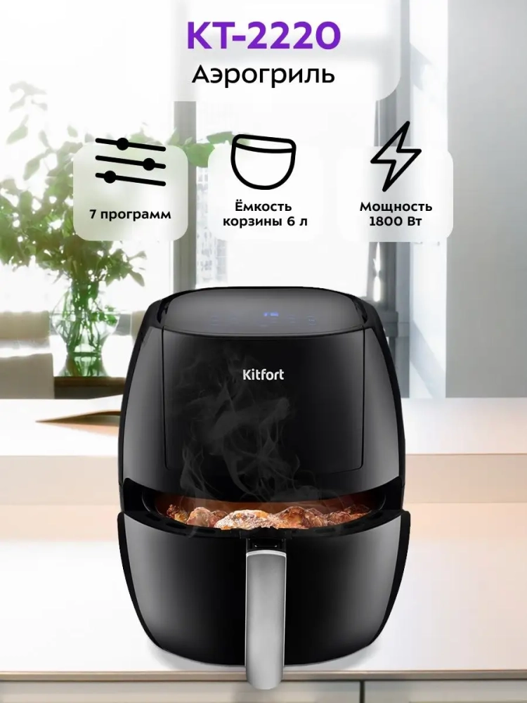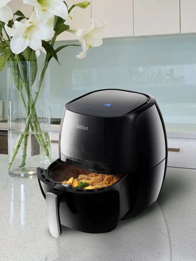 Современный аэрогриль Kitfort КТ-2220 замечателен не только стильным дизайном. Он может использоваться как аэрогриль, а также как аэрофритюрница и духовка, и позволяет готовить большинство продуктов без добавления масла.