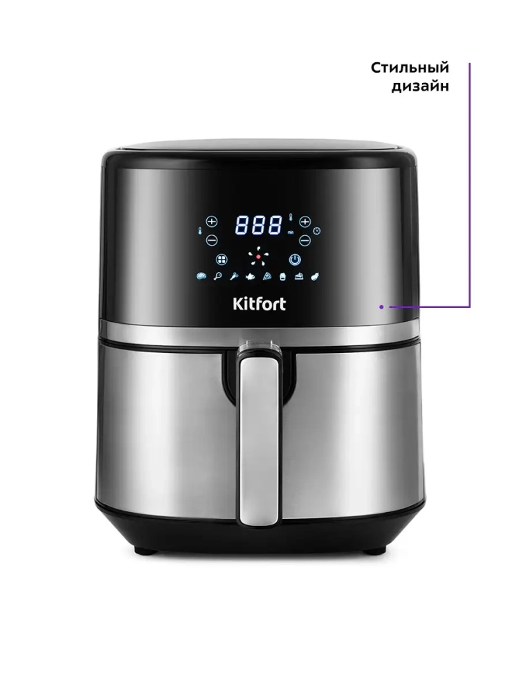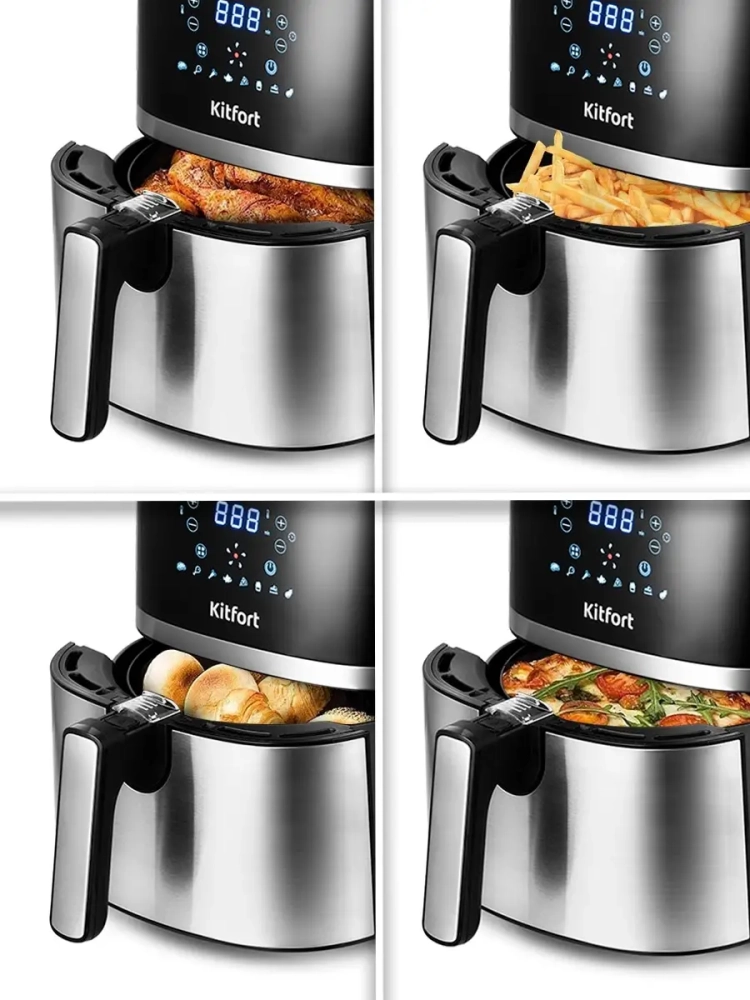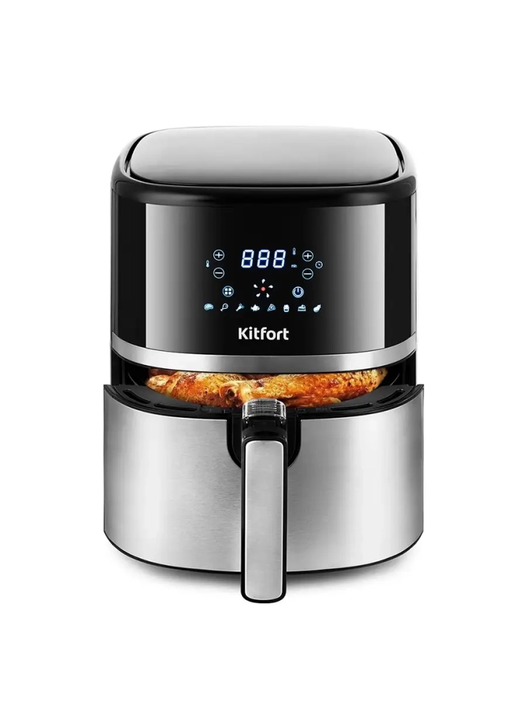 Современный аэрогриль Kitfort КТ-2221 замечателен не только стильным дизайном. Он может использоваться как аэрогриль, а также как аэрофритюрница и духовка, и позволяет готовить большинство продуктов без добавления масла. При помощи системы циркуляции горячего воздуха продукты равномерно обжариваются со всех сторон и получаются нежными внутри и с хрустящей корочкой снаружи. Аэрогриль оснащен электронным управлением, он имеет 8 автоматических программ. На дисплее отображаются температура и время приготовления. Продукты готовятся в корзине, которая устанавливается в поддон. И корзина и поддон с антипригарным покрытием. По окончании приготовления аэрогриль автоматически отключается. Поддон с корзиной легко вынимаются и моются.