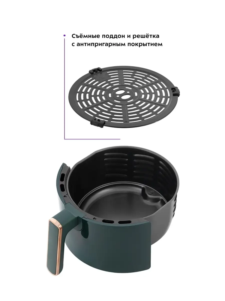 Современный аэрогриль Kitfort КТ-2222 замечателен не только стильным дизайном. Он может использоваться как аэрогриль, а также как аэрофритюрница и духовка, и позволяет готовить большинство продуктов без добавления масла. При помощи системы циркуляции горячего воздуха продукты равномерно обжариваются со всех сторон и получаются нежными внутри и с хрустящей корочкой снаружи. Аэрогриль оснащен электронным управлением, он имеет 8 автоматических программ. На дисплее отображаются температура и время приготовления. Продукты готовятся на специальной решетке, которая устанавливается в поддоне. И решетка и поддон с антипригарным покрытием. По окончании приготовления аэрогриль автоматически отключается. Поддон с решеткой легко вынимаются и моются.