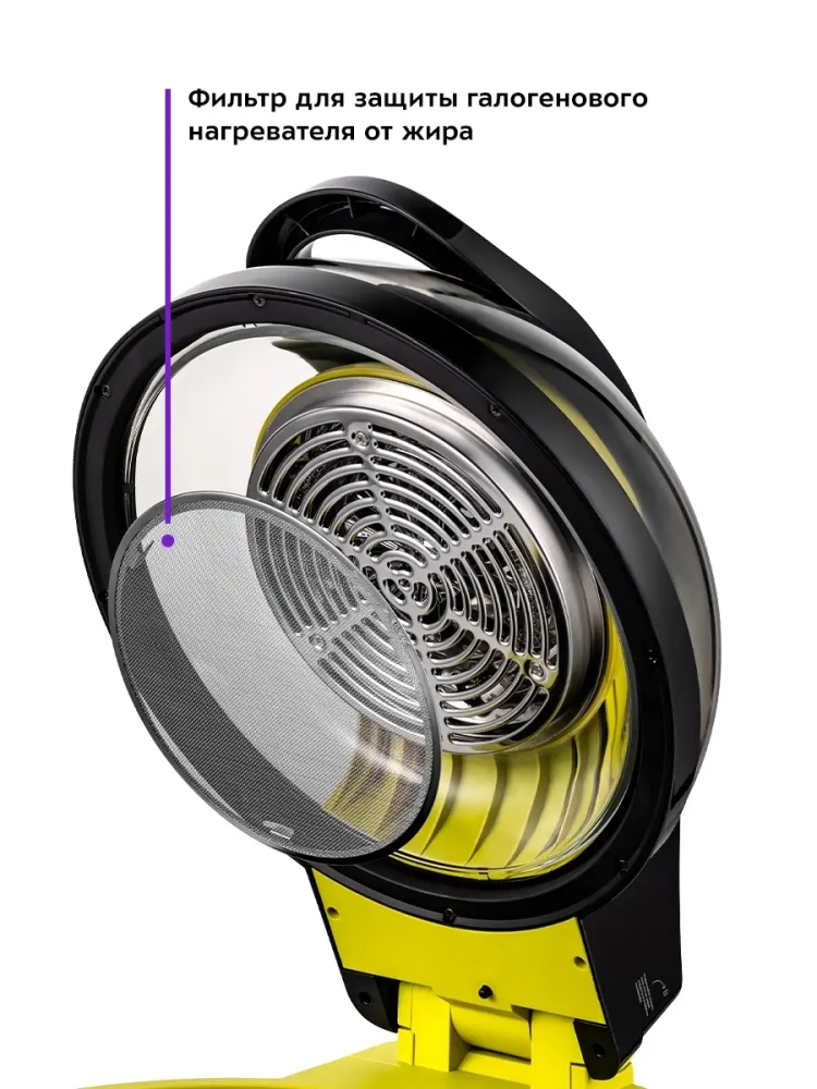 Во время работы галогеновый нагреватель подсвечивает продукты в чаше. Часть крышки сделана прозрачной, чтобы можно было наблюдать за процессом приготовления. Продукты готовятся в специальной чаше с антипригарным покрытием.