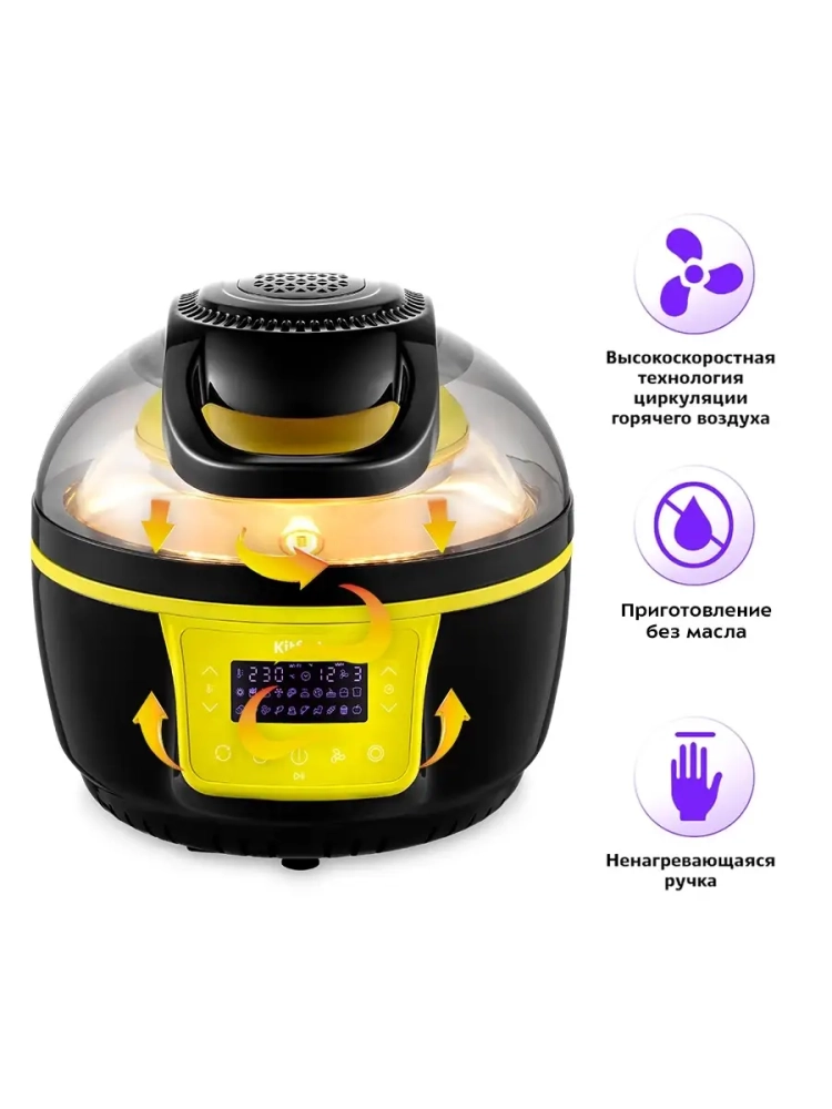 Аэрогриль Китфорт оснащен электронным управлением и дисплеем, а также у прибора есть 20 автоматических программ. Вы можете начать приготовление в установленное время, используя функцию отложенного старта.