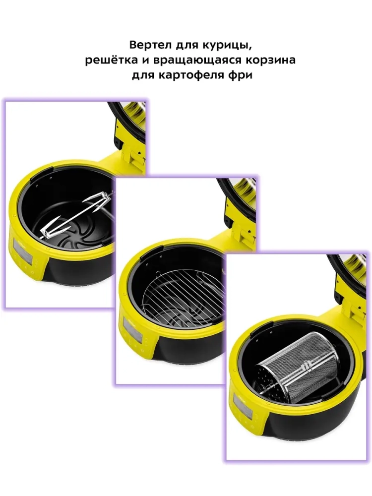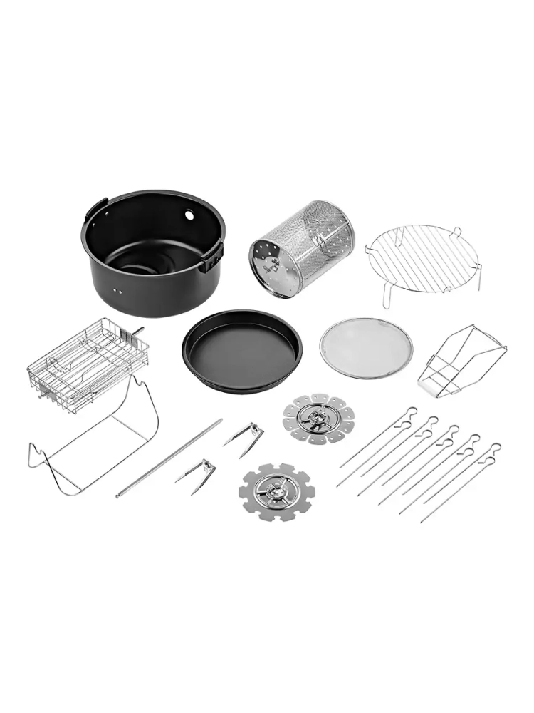 В комплекте к аэрогрилю идут вертел, щипцы, решетка, корзина, противень, шампуры и решетка для стейков. На решетке можно располагать продукты или термостойкие чаши, и готовить прямо в них. Корзина крепится к вертелу с помощью специального винта. Таким образом, приготовление курицы на вертеле или картошки фри в корзине обходится без вашего участия. В решетке для стейков удобно готовить большие куски мяса, а на шампурах готовить шашлык. Противнем вы можете воспользоваться при готовке пирога.
