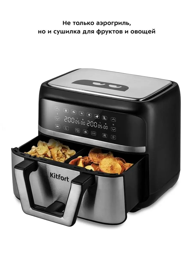 Аэрогриль электрический Kitfort КТ-2247 — это современная техника, которая станет незаменимым помощником на вашей кухне. С объемом чаши 8 литров и мощностью 2850 Вт, он позволяет готовить разнообразные блюда, даже выпечку, без добавления масла, сохраняя их полезные свойства. Этот аэрогриль оснащен двумя нагревателями и системой циркуляции горячего воздуха, что обеспечивает равномерное приготовление продуктов с хрустящей корочкой снаружи и нежной текстурой внутри. Особенность модели заключается в наличии программы для сушки овощей и фруктов. Температурный диапазон от 40 до 80 градусов и таймер от 1 до 24 часов позволяют идеально высушивать продукты. Аэрогриль также может использоваться как аэрофритюрница, гриль, а также сушилка для овощей и фруктов благодаря специальной программе. Сенсорное управление делает использование прибора простым и удобным: шесть автоматических программ приготовления помогут вам выбрать оптимальные настройки для каждого блюда. На дисплее отображаются температура, время приготовления и активные нагреватели (левый или правый). Разделитель поддона позволяет готовить два разных блюда одновременно, устанавливая индивидуальные параметры температуры и времени. Комплект включает решетку для аэрогриля, которая помогает добиться идеального результата при обжарке мяса или рыбы. Поддон легко очищается после использования благодаря антипригарному покрытию. Эта кухонная техника не только экономит ваше время на приготовление пищи, но также способствует здоровому питанию всей семьи. Аэрогриль Kitfort — это надежный выбор для тех, кто ценит качество в каждой детали.