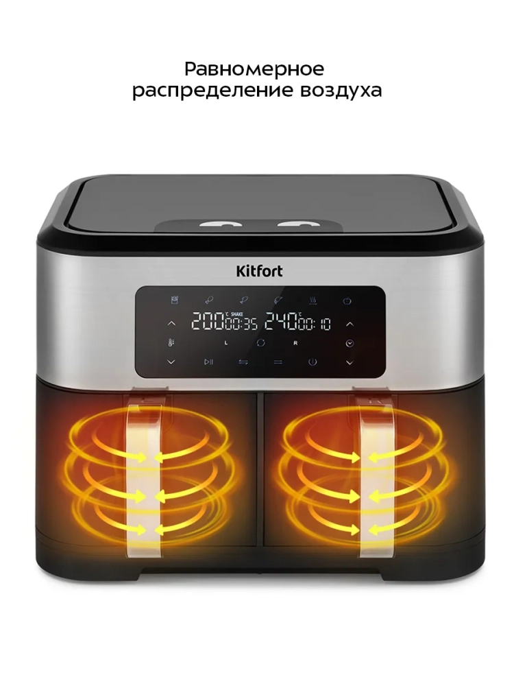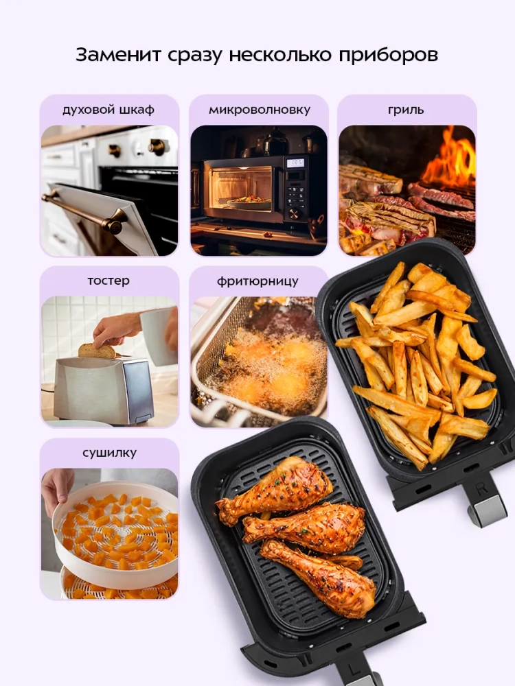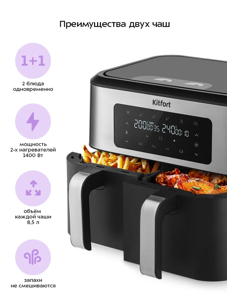 Главное преимущество данного аэрогриля заключается в том, что у него имеется два нагревателя (левый и правый) и два поддона. Благодаря двум поддонам вы можете готовить 2 разных блюда одновременно, установив при этом для каждого свои настройки температуры и таймера. Таким образом, вы можете приготовить основное блюдо и гарнир к одному времени и подать к столу горячими.