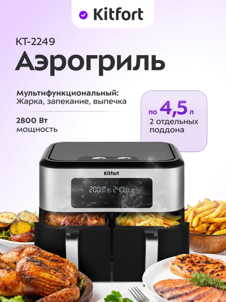 Современный аэрогриль Kitfort КТ-2249 интересен стильным дизайном: он позволяет готовить большинство продуктов без добавления масла, а также может использоваться как сушилка для овощей и фруктов.