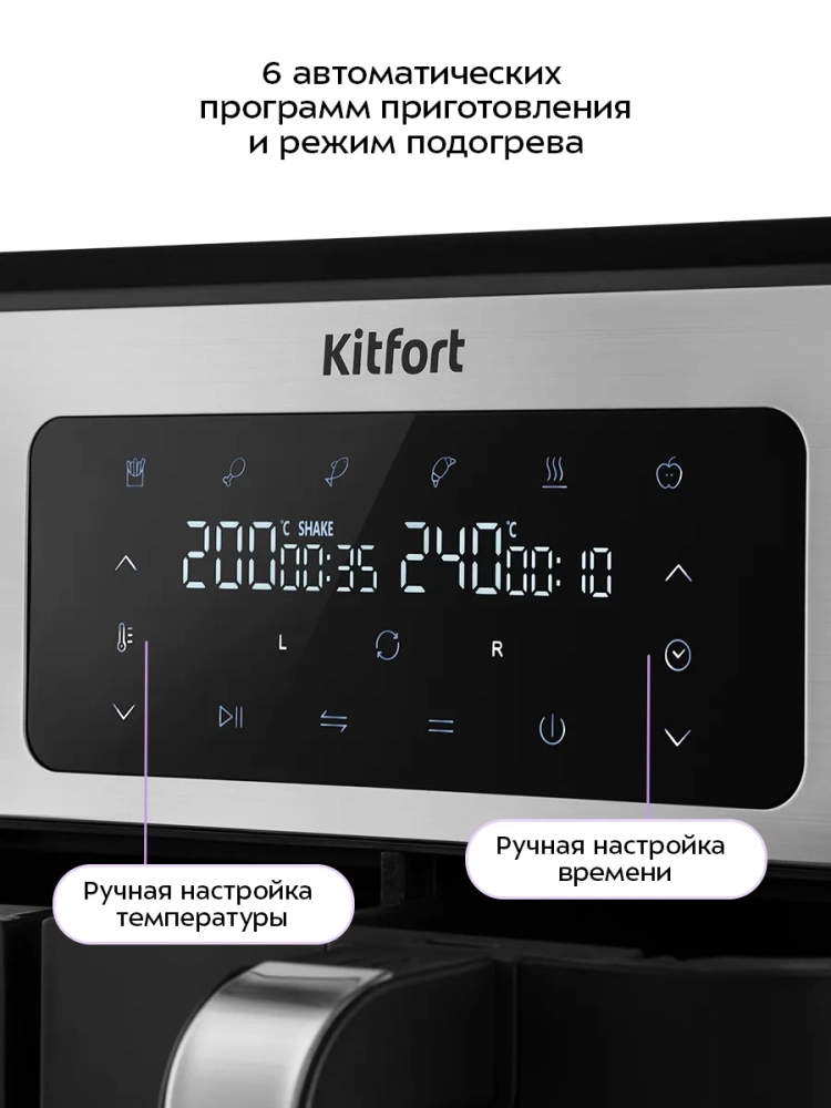 Аэрогриль оснащен сенсорным управлением, он имеет 6 автоматических программ приготовления, синхронизацию приготовления и подогрев. Программы позволяют использовать готовые шаблоны настроек, разработанные специально под конкретные блюда, поэтому вам не придется контролировать процесс приготовления самостоятельно — аэрогриль сам выберет необходимые параметры своей работы. На дисплее отображаются температура, время приготовления и какие нагреватели работают: левый, правый или оба. Продукты готовятся на специальных решетках, установленных в поддоны. И решетки и поддоны с антипригарным покрытием. По окончании приготовления аэрогриль автоматически отключается. Поддоны и решетки легко вынимаются и моются.