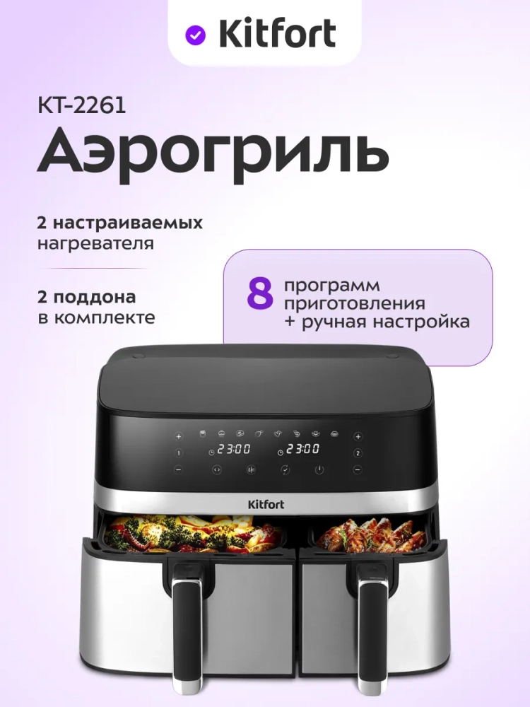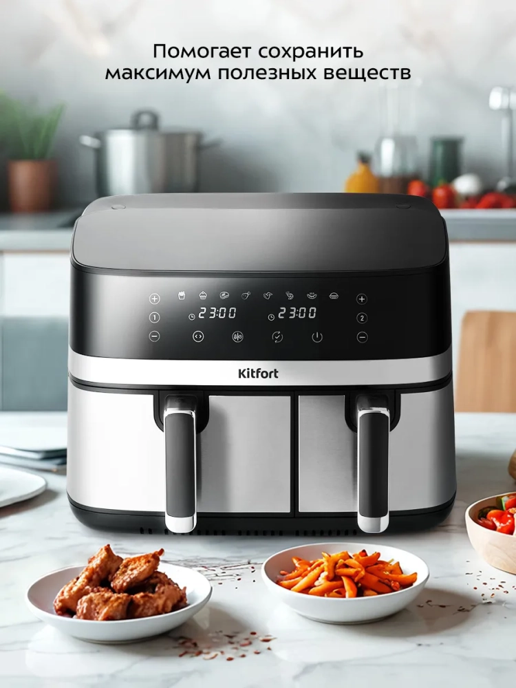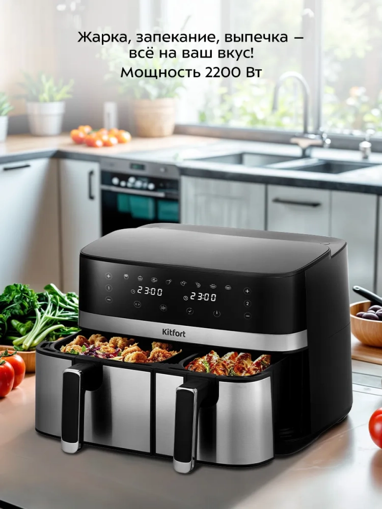 Современный аэрогриль Kitfort КТ-2261 имеет стильный дизайн и позволяет готовить большинство продуктов без добавления масла.