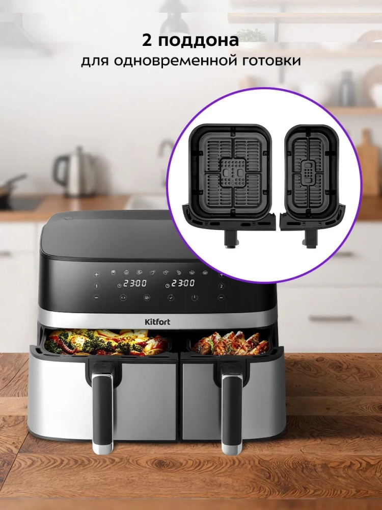Главное преимущество данного аэрогриля заключается в том, что у него имеется два нагревателя и два поддона разной емкости. Благодаря двум поддонам вы можете готовить 2 разных блюда одновременно, установив при этом для каждого свои настройки температуры и таймера. Таким образом, вы можете приготовить основное блюдо и гарнир к одному времени и подать к столу горячими.