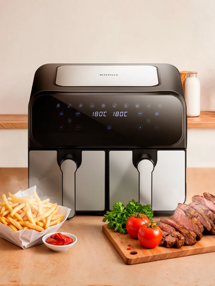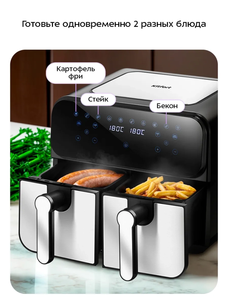Главное преимущество данного аэрогриля заключается в том, что у него имеется два нагревателя (левый и правый) и два поддона. Благодаря двум поддонам вы можете готовить 2 блюда одновременно, установив при этом для каждого свои настройки температуры и времени.