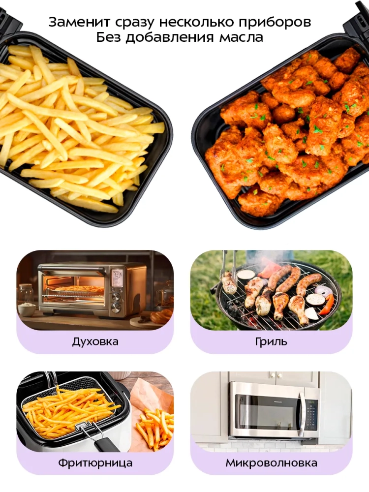 Главное преимущество данного аэрогриля заключается в том, что у него имеется два нагревателя (левый и правый) и два поддона. Благодаря двум поддонам вы можете готовить 2 блюда одновременно, установив при этом для каждого свои настройки температуры и времени.