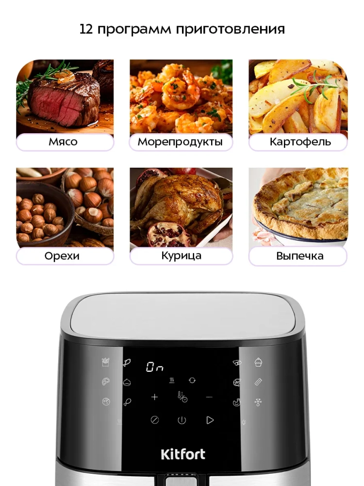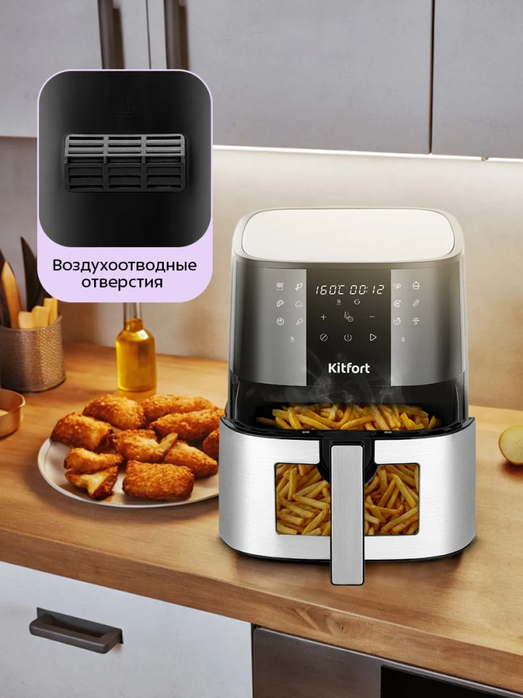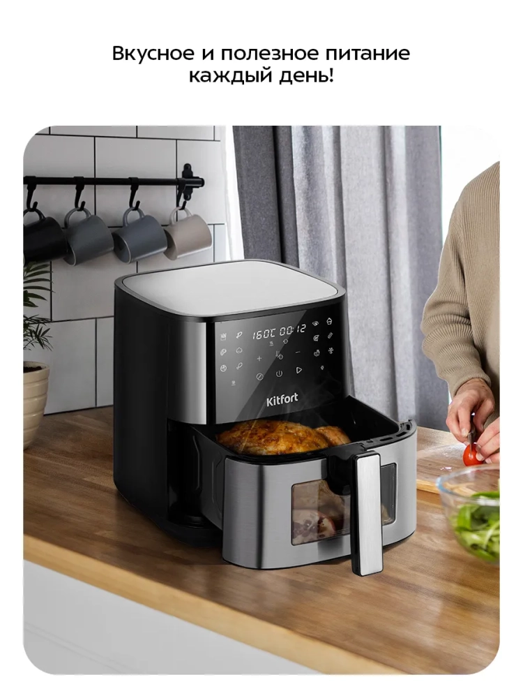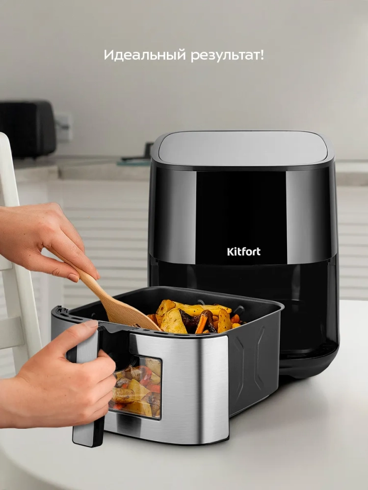Современный аэрогриль Kitfort КТ-2276 позволяет готовить большинство продуктов без добавления масла, при этом они получаются сочными и с хрустящей корочкой.