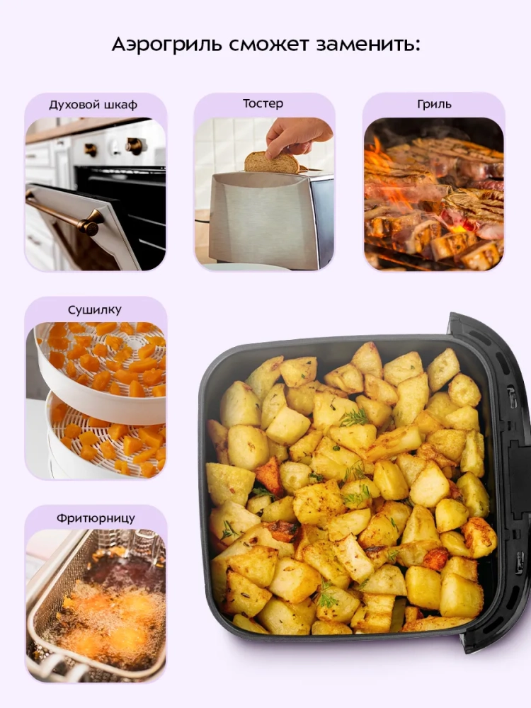 При помощи системы циркуляции горячего воздуха продукты равномерно обжариваются со всех сторон и получаются нежными внутри и хорошо запеченными снаружи. При приготовлении в аэрогриле продукты практически не пригорают (главное — правильно выставить температуру и время), а сам процесс готовки не требует постоянного присутствия на кухне. Кроме того, за счет наличия вентилятора все блюда готовятся равномерно, поэтому не бывает непропеченных или непрожаренных участков.