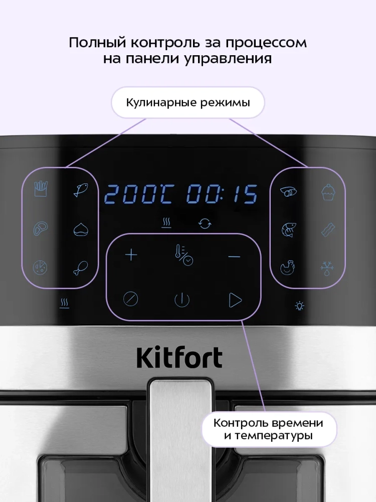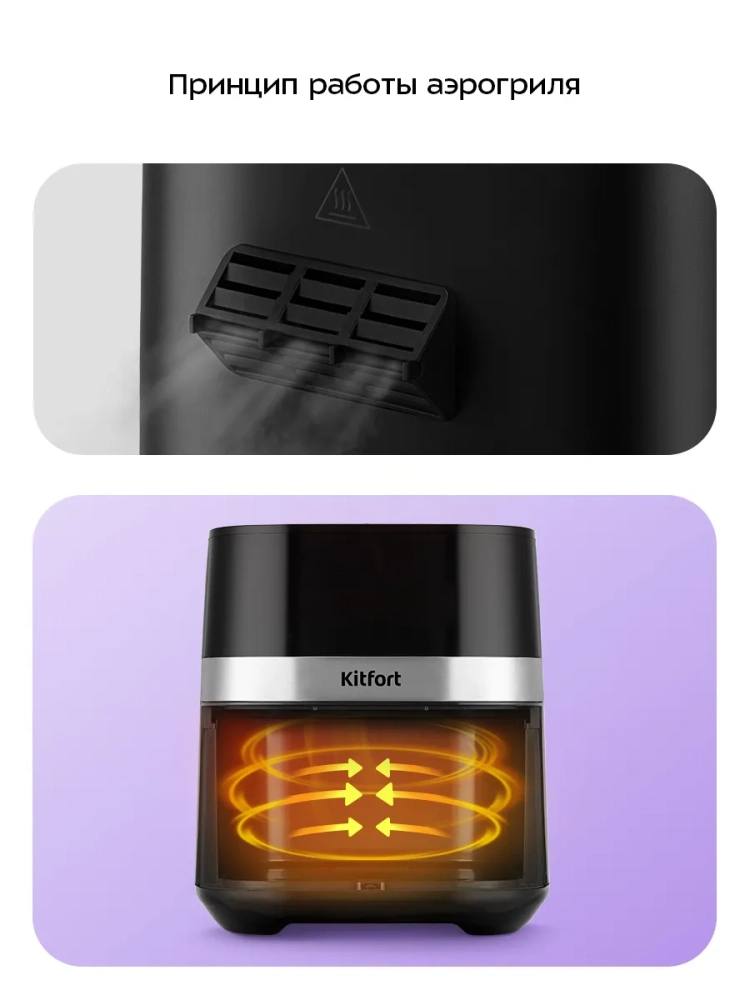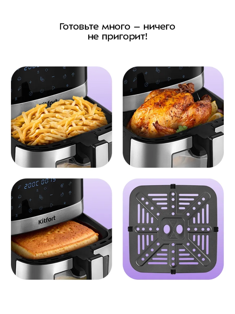 Современный аэрогриль Kitfort КТ-2277 позволяет готовить большинство продуктов без добавления масла, при этом они получаются сочными и с хрустящей корочкой.