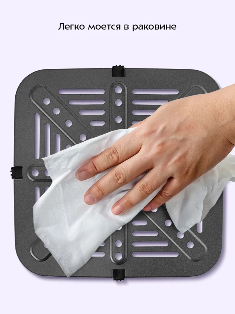 Продукты готовятся на специальной решетке, установленной в поддон. На решетку и поддон нанесено антипригарное покрытие. По окончании приготовления аэрогриль автоматически отключается. Поддон и решетка легко вынимаются и моются.
